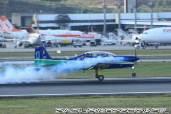 Tucano da Esquadrilha da Fumaça decolando de Guarulhos