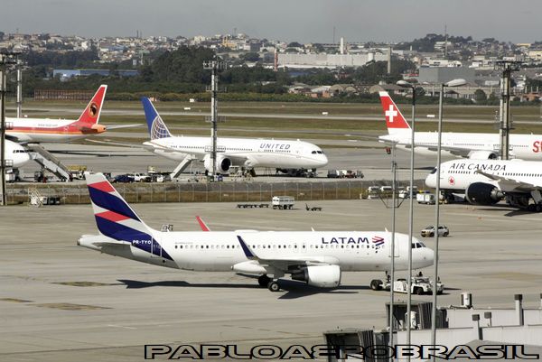 | Foto: Boeing 777-300 da Angola Airlines, Boeing 787 da United Airlines, Airbus A-320 Neo da LATAM, Boeing 777-300 da Swiss e Boeing 787 da Air Canada. | |