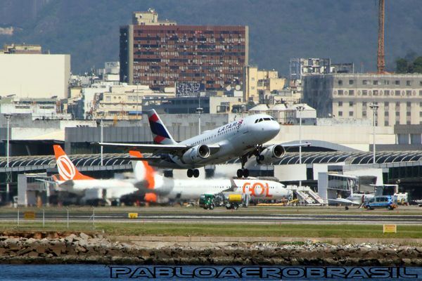 Airbus A-319 da LATAM decolando com dois Boeing's 737 da Gol ao fundo.