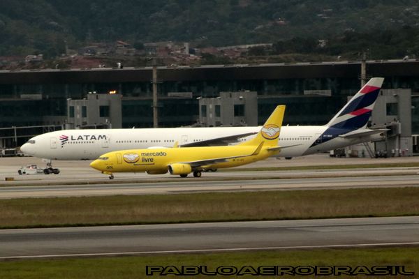 Boeing 737 da Gol (pintura da empresa Mercado Livre) junto ao Boeing 777-300 da LATAM